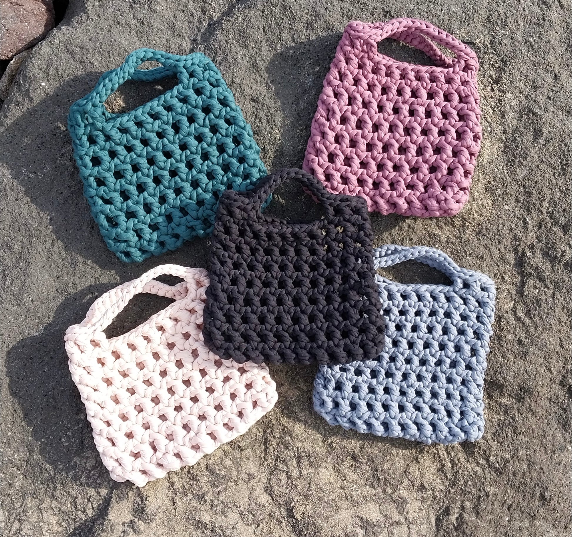handgehäkelte Tasche, 20 x 20 cm groß. Bietet Platz für tägliche Essentials wie Handy, Schlüssel und ein kleines Portemonnaie. Gefertigt aus weichem, flexiblem Garn für eine saubere, stabile Optik. Erhältlich in verschiedenen sanften, fröhlichen Farben.